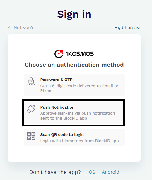 Once the 1Kosmos Mobile App has been installed and linked to your user account, you can use push authentication as an option for multi-factor authentication.