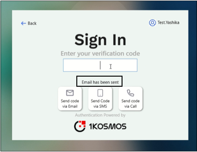 If the user selects Send Code via Email, the UI indicates to users that the Email has been sent.