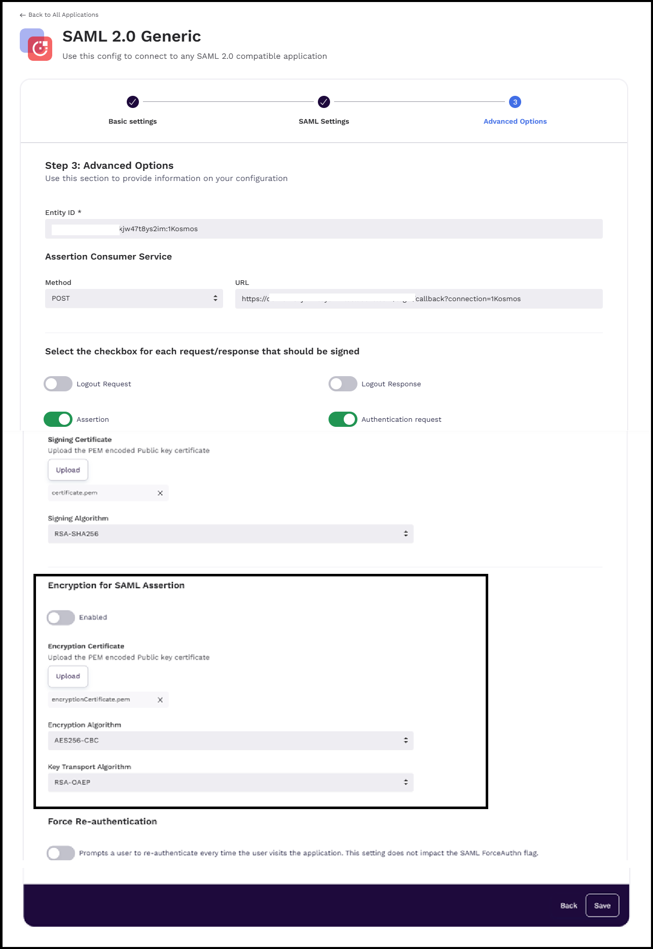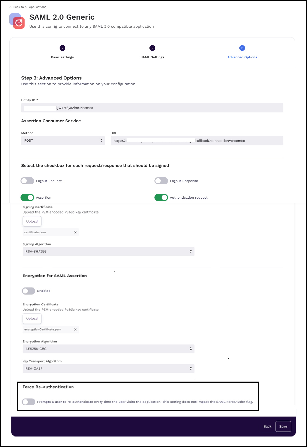 - Navigate to the Advanced Options tab of your SAML integration, enable the Force Re-authentication slider, and then click Save.