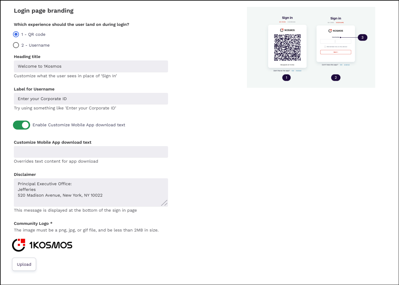 note- If you choose 1 - QR code, the login page will display a QR code instead of a username. This enables users to quickly scan the QR code in their 1Kosmos mobile app and log in without needing a password. This is the default setting.