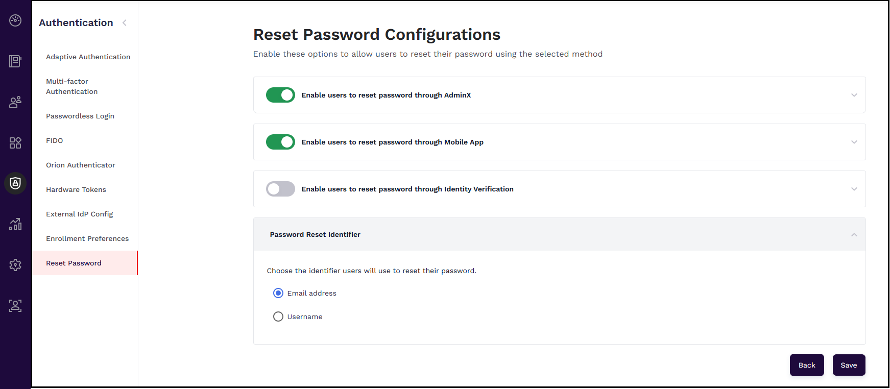 | Enable users to reset password through AdminX | Toggle to allow users to reset their password using the AdminX portal. | On/Off |