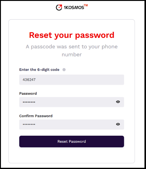 In the Reset your password page that is displayed, enter the passcode received in your phone, and then enter the new password; Click Reset Password. The UI notifies you that your password has been reset and you can click Return to Login page to login to your tenant with the new password.