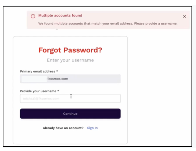 If there are multiple accounts that match the entered email address, specify the username, and then click Continue.