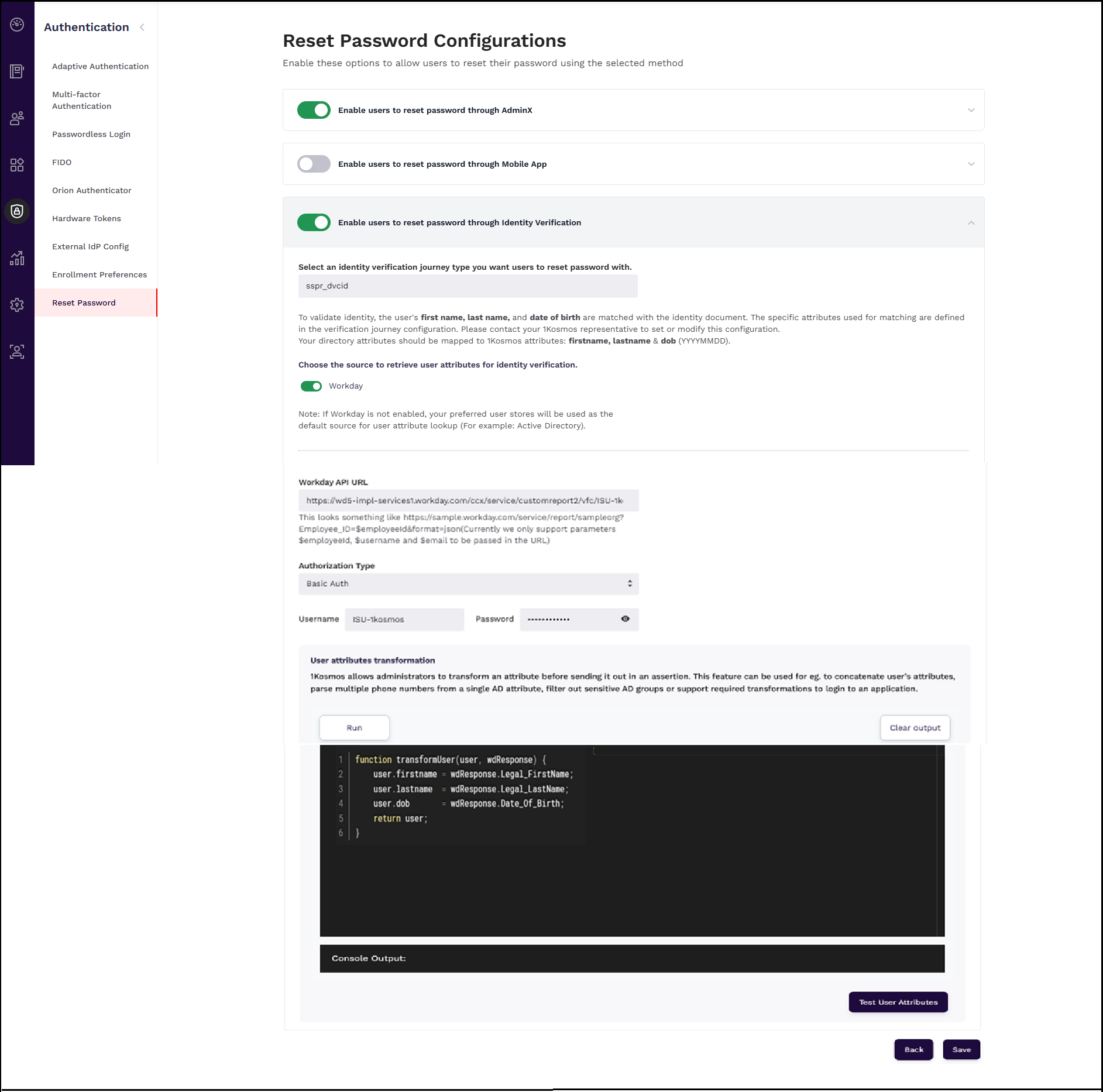 To reset the password using Identity Verification for users fetched through Workday or any other preferred user store, community administrators must enable the Enable users to reset password through Identity Verification setting of the AdminX interface and configure the appropriate settings.