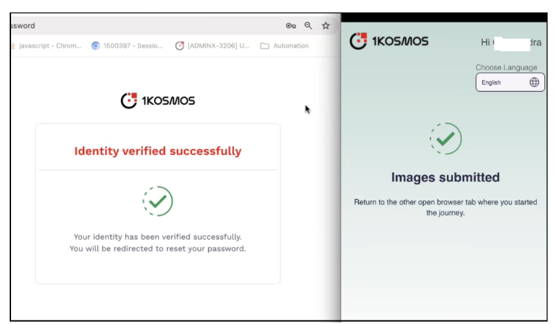 Once the authenticity has been verified, the adminX interface notifies the user that their identity has been verified, and they can proceed to reset the password.