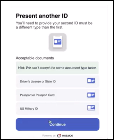 After successfully capturing your selfie, prepare the required identity documents as displayed on the screen, then click Continue to proceed.