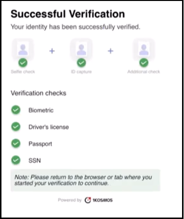 Upon successful verification, the UI confirms that your identity has been successfully verified and displays a list of the documents used during the verification process.