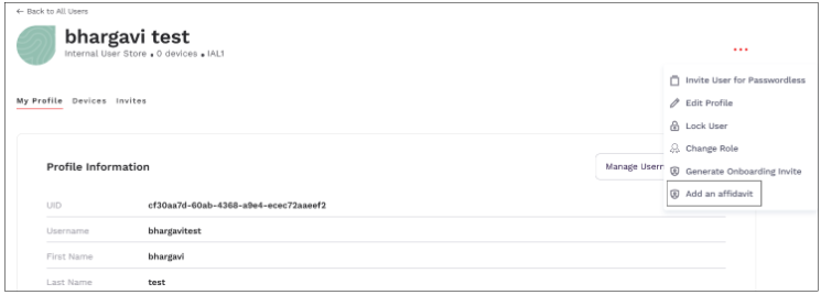 1Kosmos enables community/helpdesk administrators to add an affidavit to a user’s web wallet allowing them to become IAL2 certified users without the need to physically scan their documents. Affidavit in 1Kosmos is a declaration made by the administrators certifying the authenticity of another user's passport (PPT), Driving License (DL), or SSN. The administrator who creates the affidavit assumes responsibility for verifying the accuracy of the document. However, only administrators with the following permissions are authorized to add the affidavit.