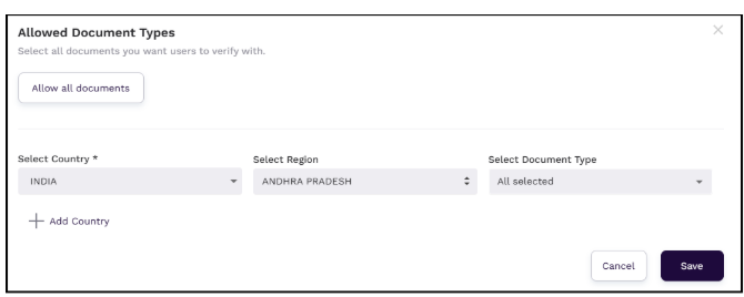 | Allowed Document Types | Select which document types are permitted for verification based on country and region. Only the selected types will be accepted. By default, the Allow toggle is selected, and the Allowed Document Types dropdown is displayed. If you switch the toggle to Block, the Blocked Document Types dropdown appears instead. Click it to select the documents you want to restrict from being used for verification. - In the Allowed Document Types selection window, click the Allow all documents button to allow all supported documents for verification. - You can also specify the country and region to narrow down which documents are available for selection. When selecting document types, the region determines whether the document format is national (used across the country) or regional (specific to a state or locality). - If you select Region: National, the document follows a country-wide format. Example - Country: India - Region: National - Document Type: Driver License - Displayed as: INDIA, DRIVER LICENSE Although NATIONAL is not shown in the label, this refers to a standardized national document format. - If you select a specific region, such as state: Example - Country: India - Region: Andhra Pradesh - Document Type: Driver License - Displayed as: INDIA, ANDHRA PRADESH, DRIVER LICENSE National and regional formats must be selected individually as needed — choosing one does not automatically include the other. |