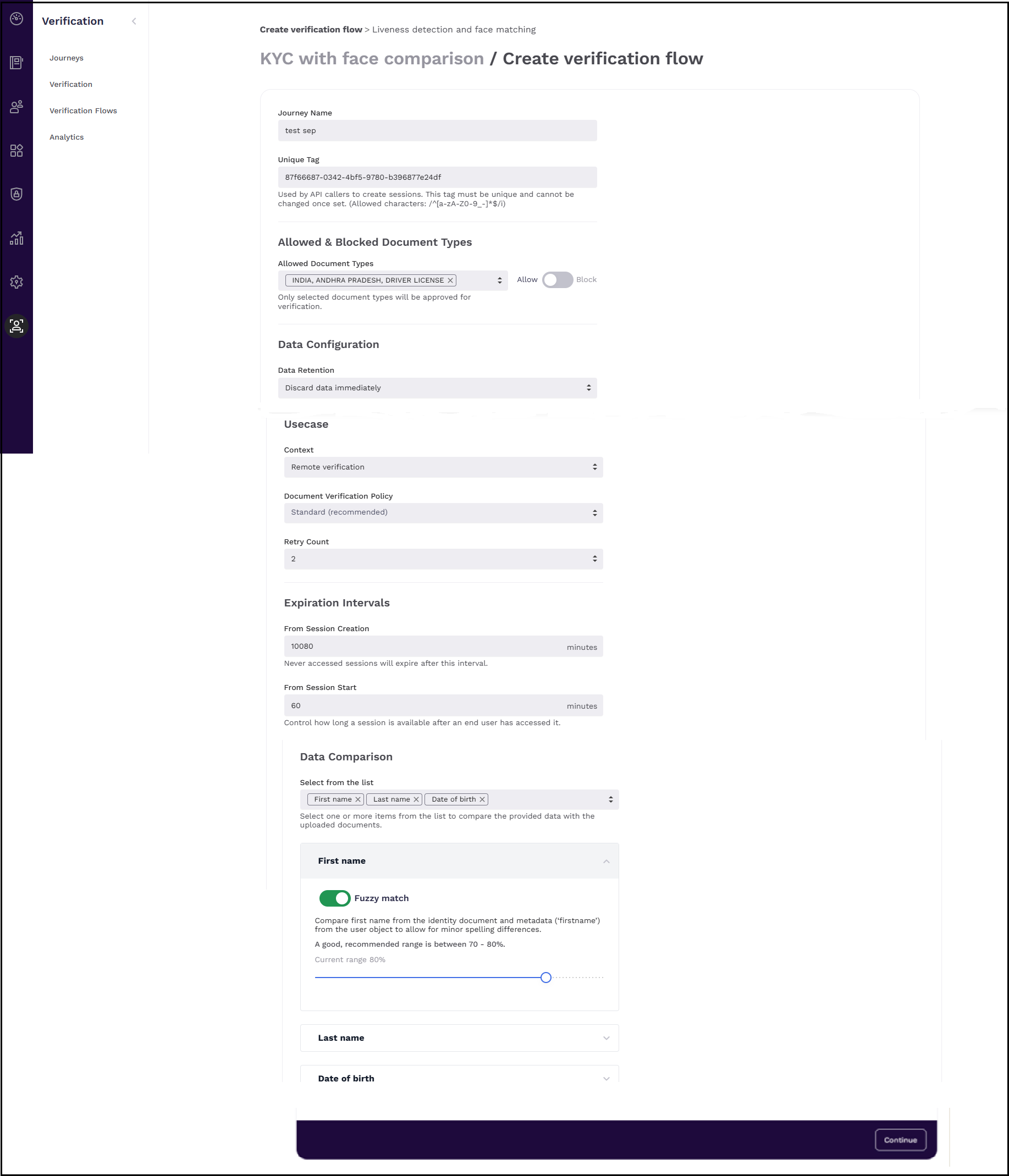 | Continue | Proceeds to the next step in setting up the verification journey. |