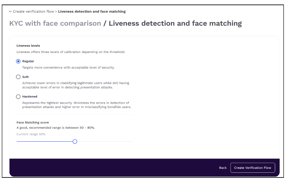 - Manage face liveness and face matching threshold - In Step 3, administrators can configure Face Liveness (Soft, Regular, or Hardened) and set the Face Comparison Threshold (default: 50%) to control the sensitivity of biometric matching.