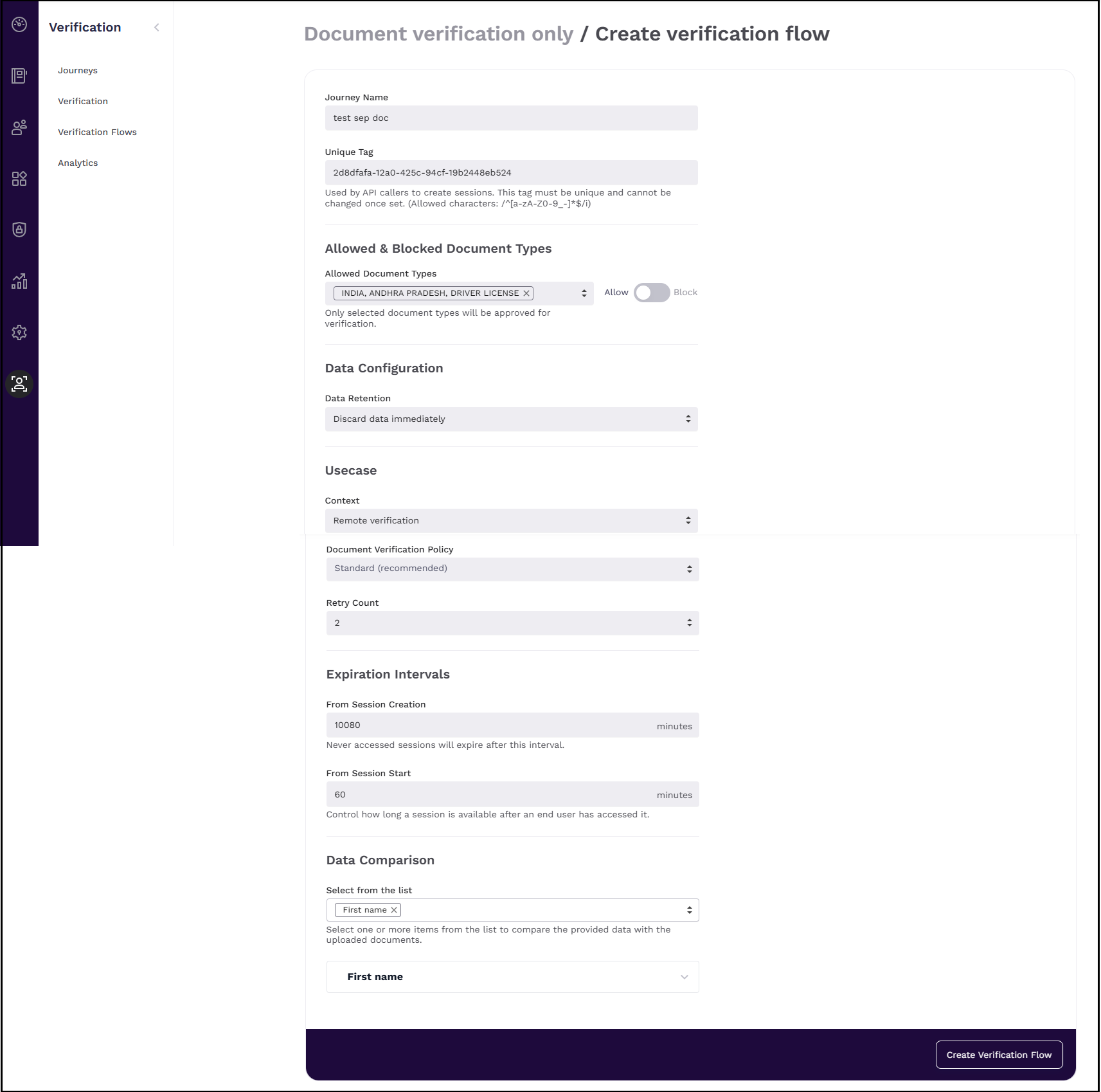 | Create Verification Flow (button) | Saves the configuration and proceeds with creating the verification flow. |