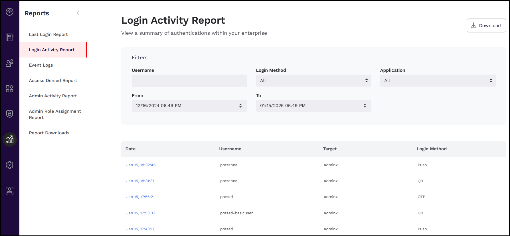 The Login Activity Report dashboard contains detailed data on authentication and login activity for your tenant. Reports can be filtered by username, multi-factor authentication methods, applications, and date.
