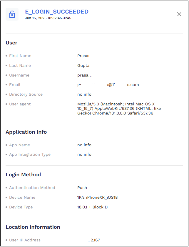 - In the event page that is displayed, view the complete details of the user activity. The event page is divided into the following sections:
