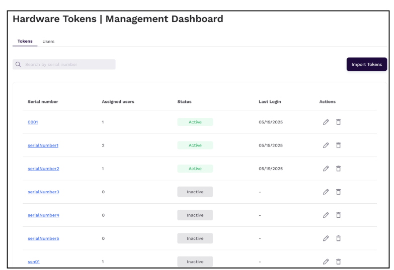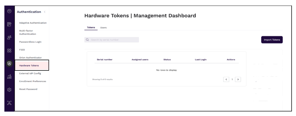 - Navigate to Authentication > Hardware Tokens. The Hardware Tokens Management dashboard is displayed.