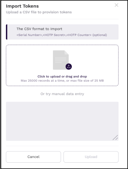 Click the Upload icon to browse the CSV file for upload or manually paste the token details in the following format in the blank area.