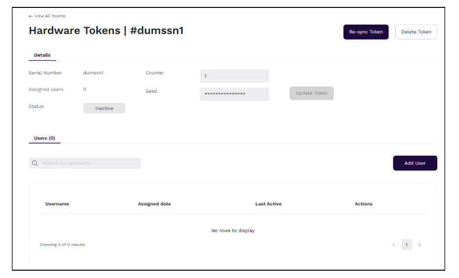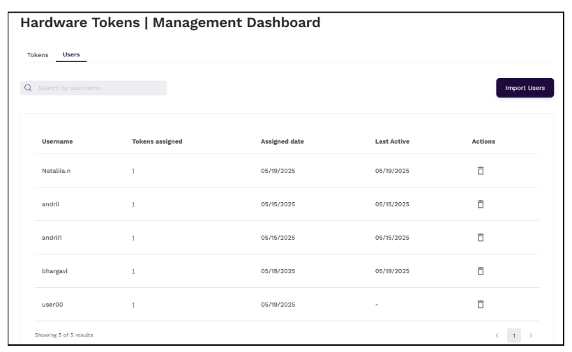 View the list of users, their assigned tokens, the date on which the tokens are assigned, and delete user assignments. The Last Active is the date when the user used their token to authenticate.