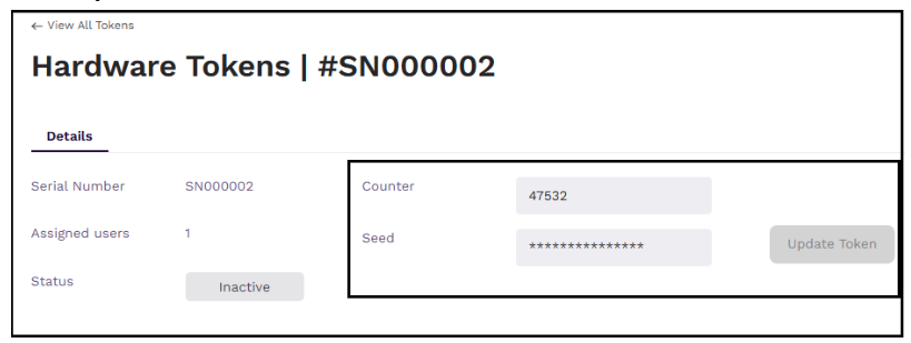 Community administrators with the authentication.hardware-tokens.update permission can modify or update the token details such as counter and seed value.