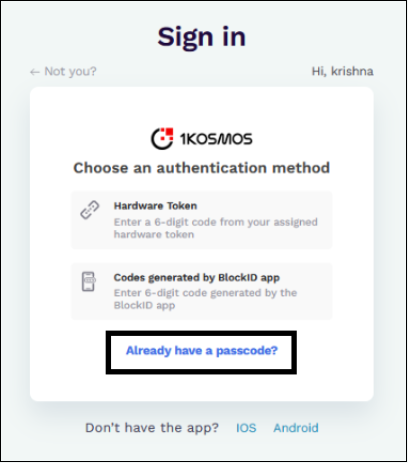 In the Sign in – Choose an authentication method screen, click the Already have a passcode? link.