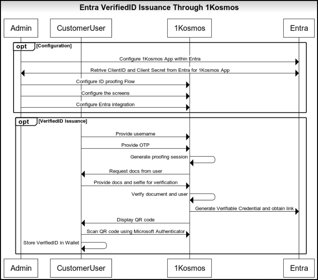 To set up the Verified ID issuance process, the administrator performs the following configuration steps in Entra and 1Kosmos.
