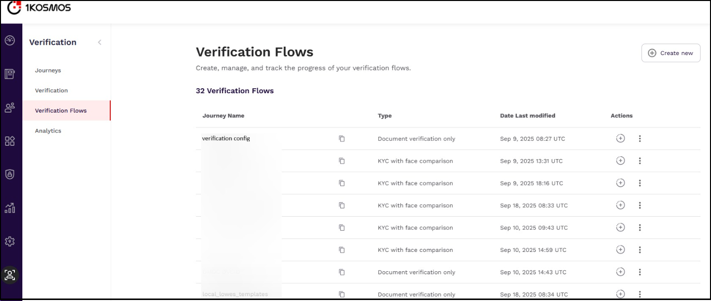 - Use the 1Kosmos' Verification Flows page in the AdminX interface to create and manage verification journeys.