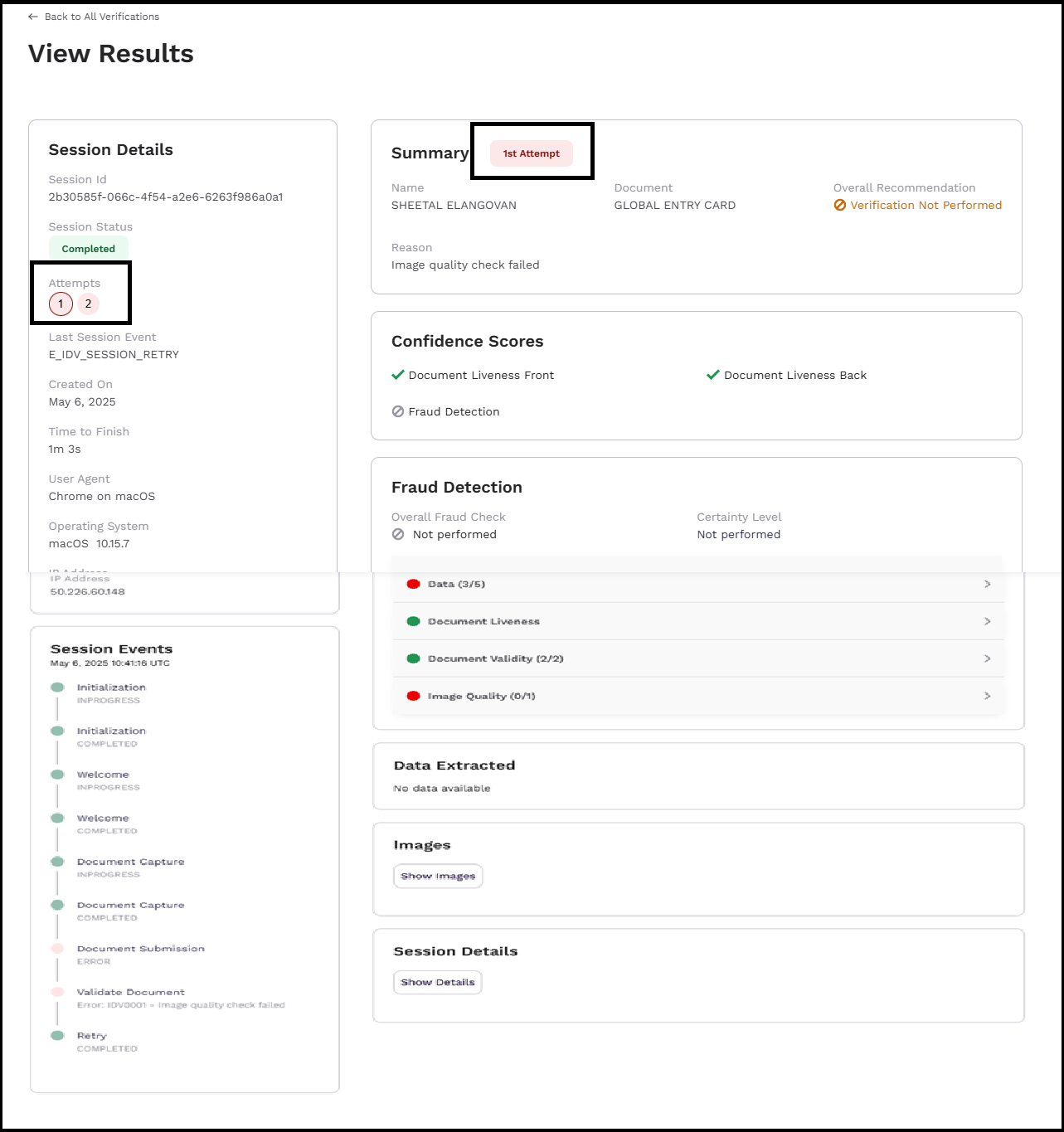 When the session status is Verification Not Performed, the Session Details section now displays the number of failed attempts the user has made to complete the verification process. This is managed in DVCID via a new parameter, maxRetries. In 1Kosmos, the status "Verification Not Performed" indicates that the captured image does not meet the required quality criteria, prompting users to retry document scanning.